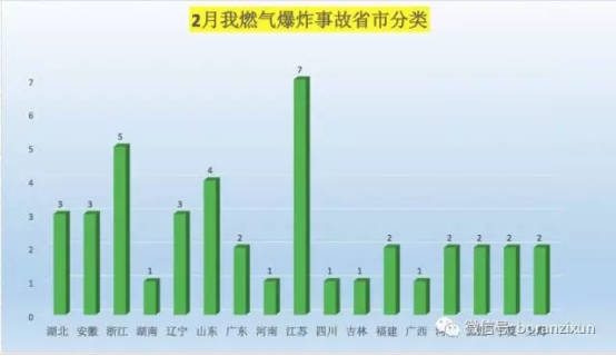 2017年2月燃?xì)獗ㄊ鹿是?位省份為江蘇省(7起)、浙江省(5起)、山東省(4起)。